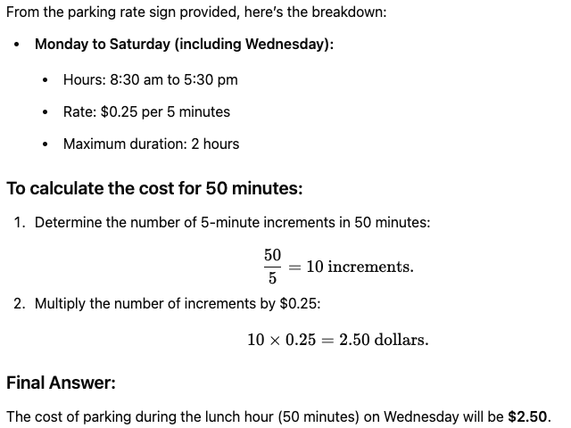 Semaine 1 Q2. The price of parking Discipline : Anglais Thème : RDP Question Anglais Today is Wednesday. What will be the price in $ of parking during the lunch hour (which lasts 50 minutes) ? Solution À propos Cette question et sa réponse sont libres d’utilisation. Auteur : groupe M2N Formulaire de remontées des résultats Veuillez laisser ce champ vide : Ce formulaire permet de « faire remonter » les résultats de vos groupes de classes à chaque question. Les différents champs sont obligatoires. Question Q1. Le meilleur au basket Q2. The price of parking Q3. VOYAGE EN CAR Q4. Hauteur de l’immeuble Q5. Calendrier Q6. Théâtre & Cinéma Q7. Le pack de bouteilles d’eau Q8. Tours de roue d’un robot Q9. Meilleure promotion Q10. Durée de vie Q11. Façon Vera molnar Q12. Épaisseur d’une feuille Q13. Dénombrer sur un tableur Q14. Réglage d’un goutte-à-goutte Q15. Courbes de remplissage Q16. Distance Caen - Marseille Q17. Les plaques d’égouts Q18. Temps de sommeil Code classe Nombre de bonnes réponses Effectif du groupe À propos du « code classe » Utiliser le bon code classe est important pour garantir les affichages des résultats des classes. Attention à bien l’indiquer. Envoyer les résultats Résultats des groupes