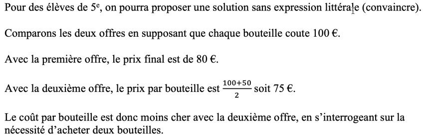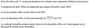 Semaine 3 Q9. Meilleure promotion Discipline : Maths Thème : Esprit critique Question Mathématiques Quelle est la meilleure offre ? Solution Formulaire de remontées des résultats Ce formulaire permet de « faire remonter » les résultats de vos groupes de classes à chaque question. Les différents champs sont obligatoires. Question Q1. Le meilleur au basket Q2. The price of parking Q3. VOYAGE EN CAR Q4. Hauteur de l’immeuble Q5. Calendrier Q6. Théâtre & Cinéma Q7. Le pack de bouteilles d’eau Q8. Tours de roue d’un robot Q9. Meilleure promotion Q10. Durée de vie Q11. Façon Vera molnar Q12. Épaisseur d’une feuille Q13. Dénombrer sur un tableur Q14. Réglage d’un goutte-à-goutte Q15. Courbes de remplissage Q16. Distance Caen - Marseille Q17. Les plaques d’égouts Q18. Temps de sommeil Veuillez laisser ce champ vide : Code classe Nombre de bonnes réponses Effectif du groupe À propos du « code classe » Utiliser le bon code classe est important pour garantir les affichages des résultats des classes. Attention à bien l’indiquer. Envoyer les résultats Résultats des groupes